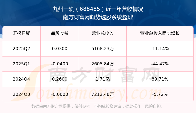 九州一軌2025年第二季度顯示,公司主營收入6168.23萬元,同比-11.14%;歸母凈利潤389.17萬元,同比144.28%;扣非凈利潤343.83萬元,同比133.38%。