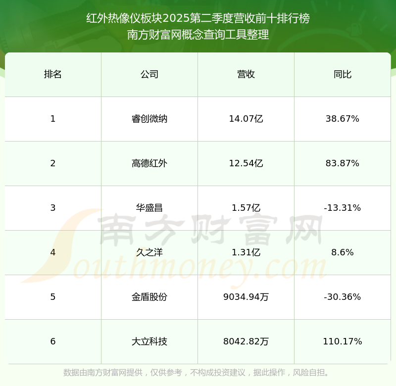 按照南方財(cái)富網(wǎng)概念查詢(xún)工具統(tǒng)計(jì),該股所屬板塊為紅外熱像儀板塊,該板塊共有6只股票,睿創(chuàng)微納2025第二季度營(yíng)收在該板塊中排名為第1名,該板塊2025第二季度營(yíng)收排名前十的股票如下表: