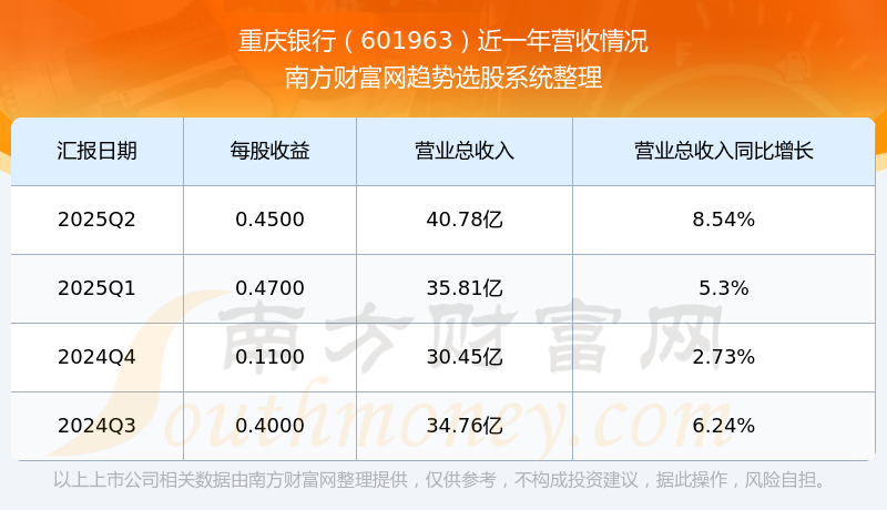 重慶銀行發(fā)布2025年第二季度財報。實現(xiàn)總營收40.78億元,同比增長8.54%;扣非凈利潤同比增長6.38%至15.64億元。