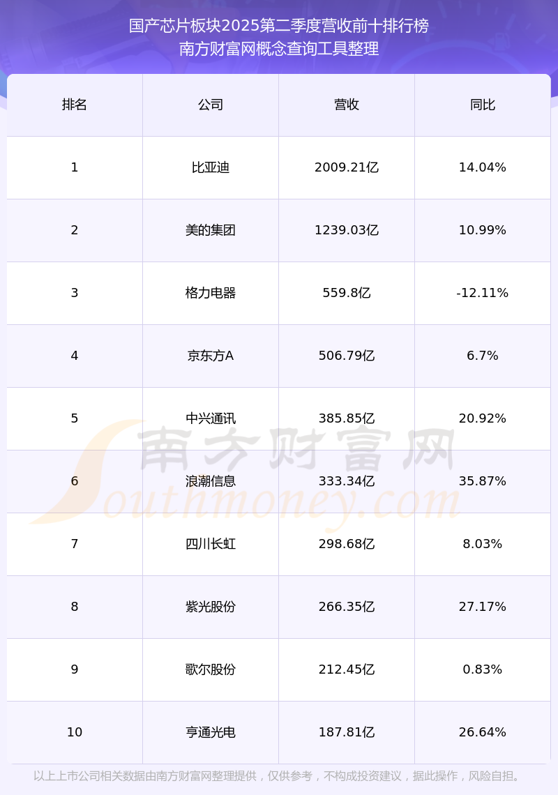 按照南方財(cái)富網(wǎng)概念查詢工具統(tǒng)計(jì),該股所屬板塊為國產(chǎn)芯片板塊,該板塊共有391只股票,電科芯片2025第二季度營收在該板塊中排名為第273名,該板塊2025第二季度營收排名前十的股票如下表: