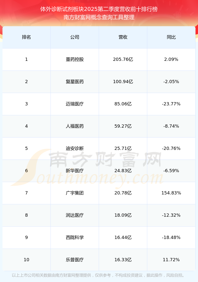 按照南方財(cái)富網(wǎng)概念查詢(xún)工具統(tǒng)計(jì),該股所屬板塊為體外診斷試劑板塊,該板塊共有63只股票,奧泰生物2025第二季度營(yíng)收在該板塊中排名為第37名,該板塊2025第二季度營(yíng)收排名前十的股票如下表: