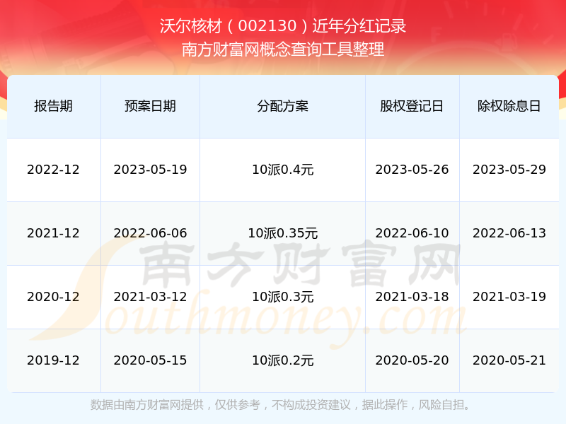 沃爾核材最新一次公布的分紅方案為10派0.4元。本次權(quán)益分派股權(quán)登記日為2023年5月26日,除權(quán)除息日為2023年5月29日,派息日為2023年5月29日。