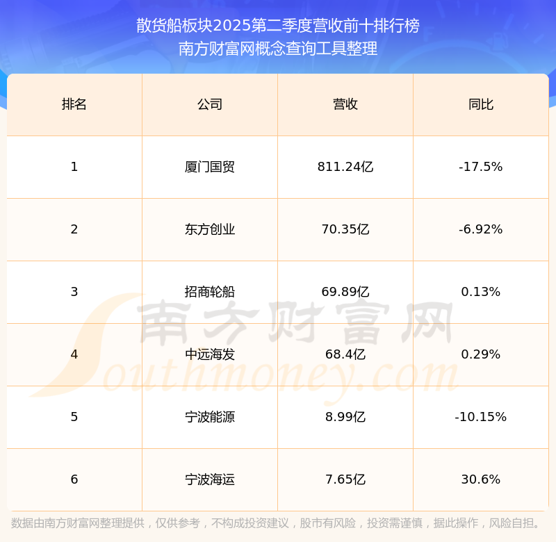 按照南方財富網(wǎng)概念查詢工具統(tǒng)計,該股所屬板塊為散貨船板塊,該板塊共有6只股票,中船防務(wù)2025第二季度營收在該板塊中排名為第6名,該板塊2025第二季度營收排名前十的股票如下表: