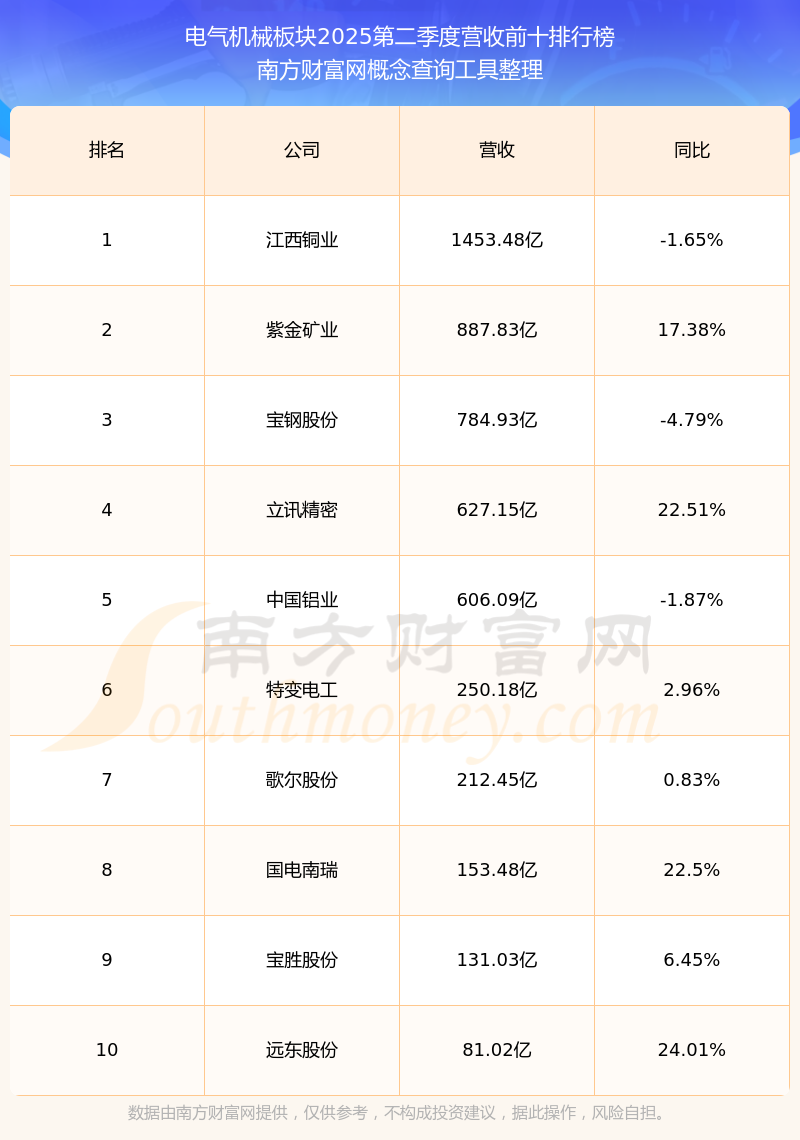 按照南方財(cái)富網(wǎng)概念查詢工具統(tǒng)計(jì),該股所屬板塊為電氣機(jī)械板塊,該板塊共有29只股票,東方電纜2025第二季度營收在該板塊中排名為第29名,該板塊2025第二季度營收排名前十的股票如下表: