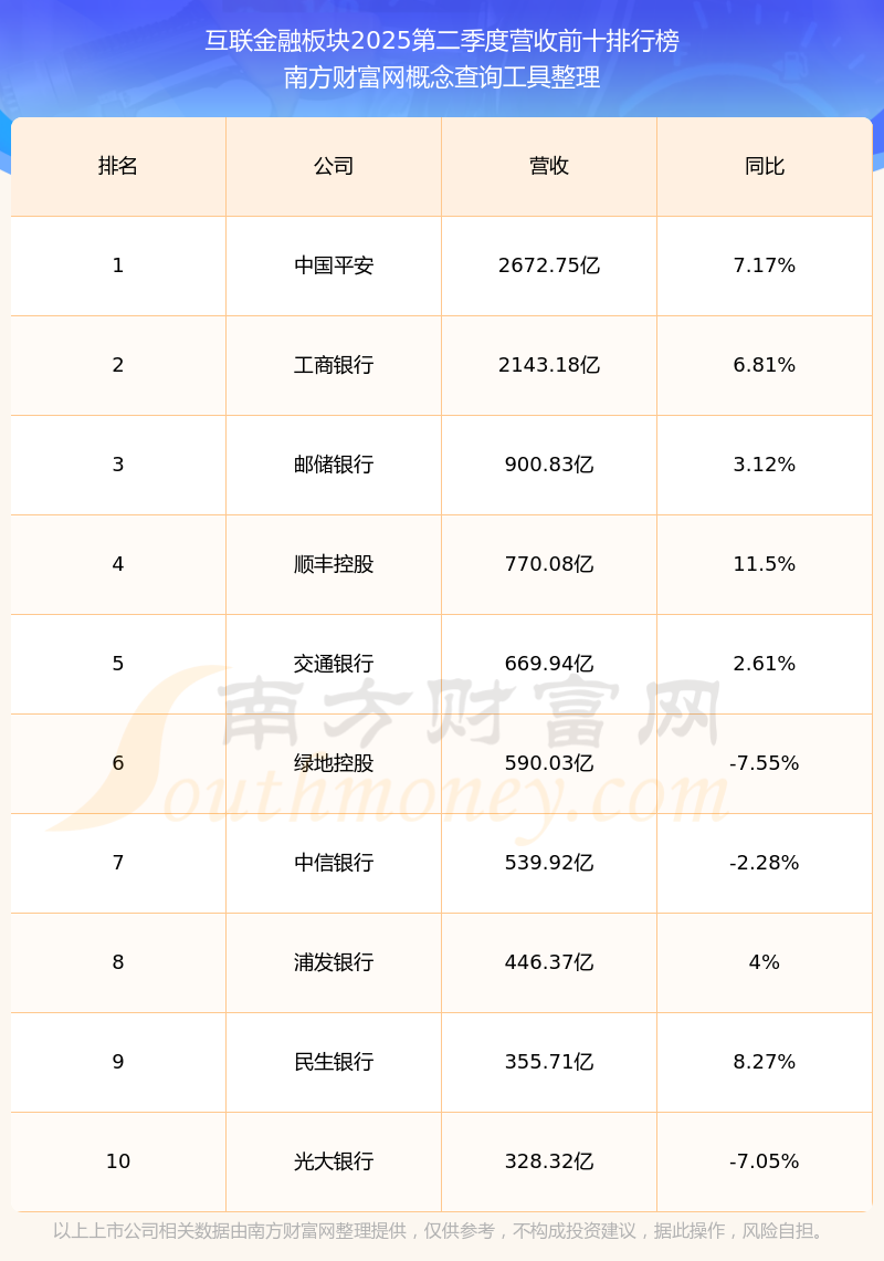 按照南方財富網(wǎng)概念查詢工具統(tǒng)計,該股所屬板塊為互聯(lián)金融板塊,該板塊共有239只股票,金證股份2025第二季度營收在該板塊中排名為第130名,該板塊2025第二季度營收排名前十的股票如下表: