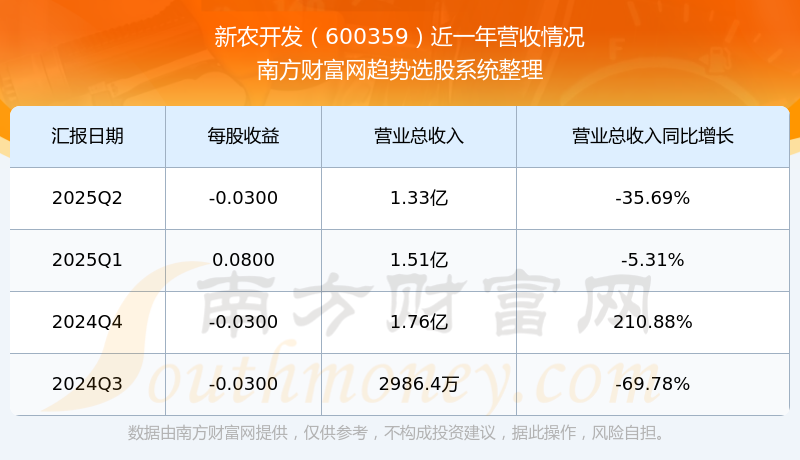 新農(nóng)開發(fā)(600359)披露2025年第二季度報告,報告期實現(xiàn)營收1.33億元,同比-35.69%;歸母凈利潤-1129.28萬元,同比-412.79%;扣非凈利潤-724.73萬元,同比-395.95%;基本每股收益-0.03元。