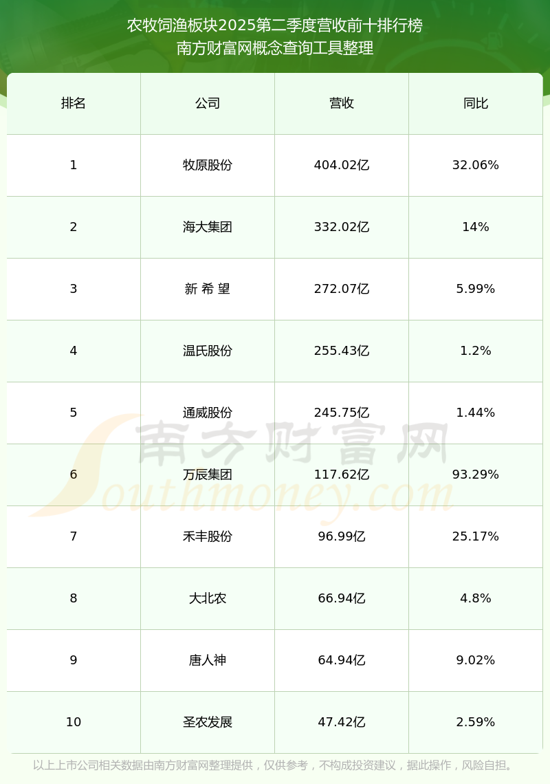 按照南方財富網(wǎng)概念查詢工具統(tǒng)計,該股所屬板塊為農(nóng)牧飼漁板塊,該板塊共有78只股票,新農(nóng)開發(fā)2025第二季度營收在該板塊中排名為第72名,該板塊2025第二季度營收排名前十的股票如下表: