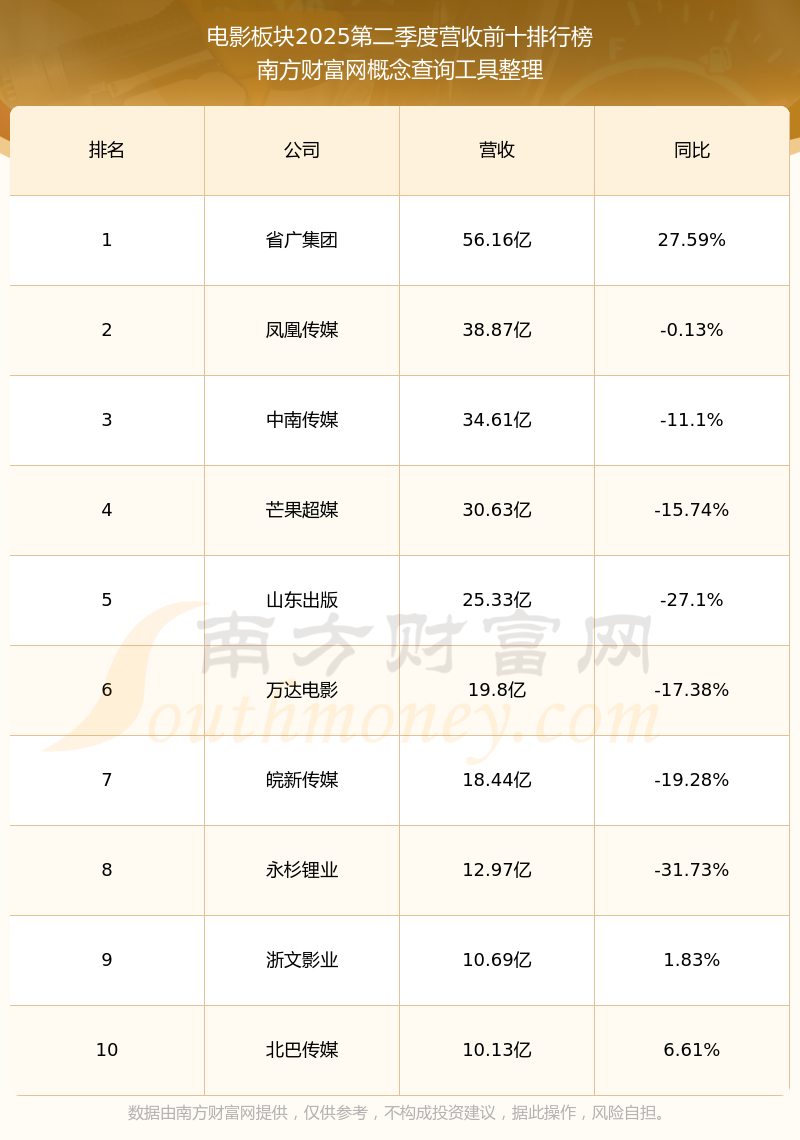 按照南方財富網(wǎng)概念查詢工具統(tǒng)計,該股所屬板塊為電影板塊,該板塊共有44只股票,上海電影2025第二季度營收在該板塊中排名為第33名,該板塊2025第二季度營收排名前十的股票如下表: