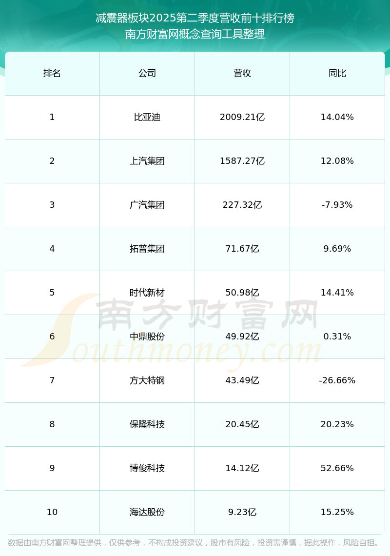 按照南方財(cái)富網(wǎng)概念查詢工具統(tǒng)計(jì),該股所屬板塊為減震器板塊,該板塊共有21只股票,拓普集團(tuán)2025第二季度營(yíng)收在該板塊中排名為第4名,該板塊2025第二季度營(yíng)收排名前十的股票如下表: