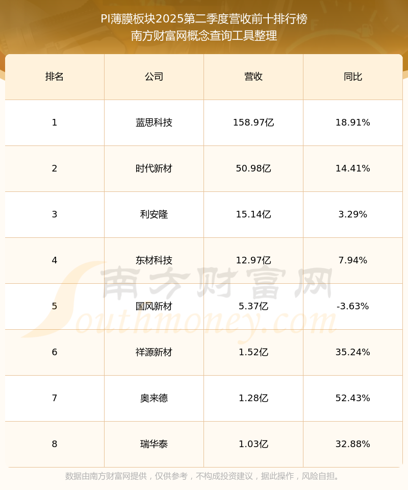 按照南方財富網(wǎng)概念查詢工具統(tǒng)計,該股所屬板塊為PI薄膜板塊,該板塊共有8只股票,瑞華泰2025第二季度營收在該板塊中排名為第8名,該板塊2025第二季度營收排名前十的股票如下表: