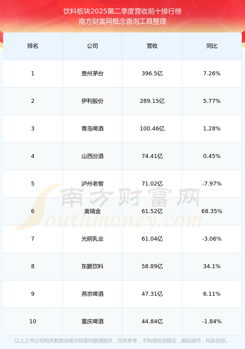 按照南方財富網(wǎng)概念查詢工具統(tǒng)計,該股所屬板塊為飲料板塊,該板塊共有79只股票,東鵬飲料2025第二季度營收在該板塊中排名為第8名,該板塊2025第二季度營收排名前十的股票如下表: