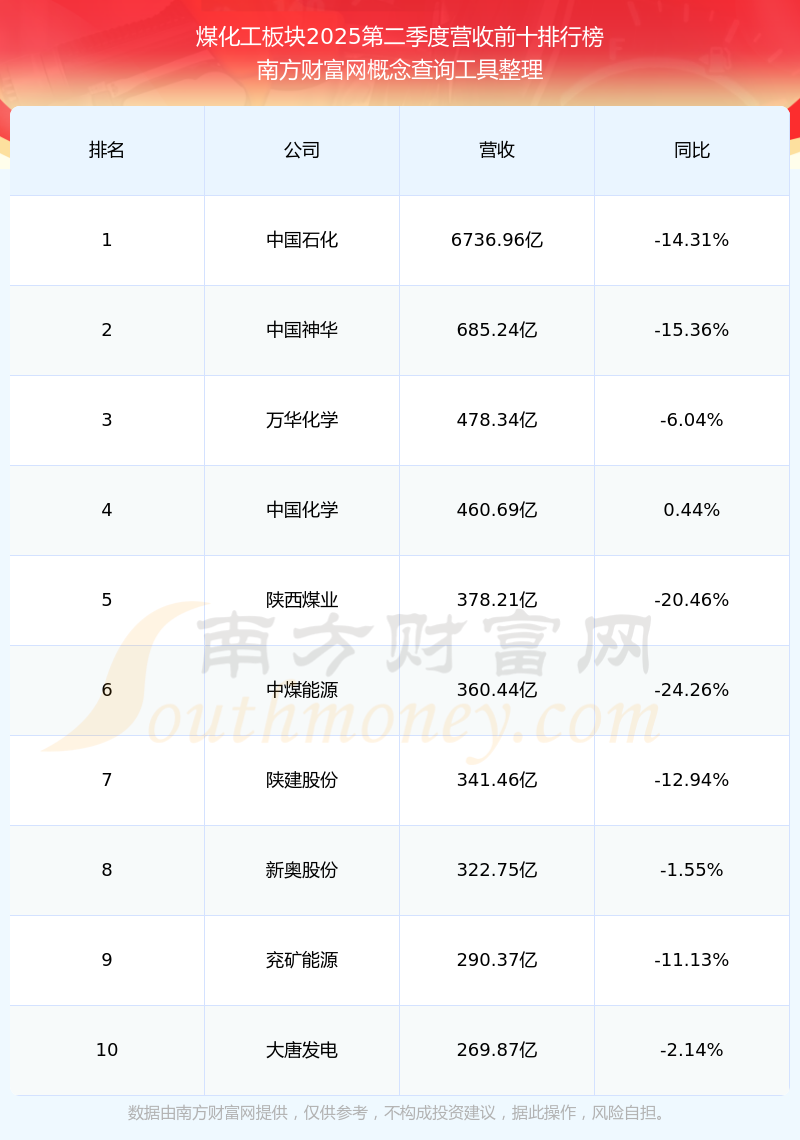 按照南方財富網(wǎng)概念查詢工具統(tǒng)計,該股所屬板塊為煤化工板塊,該板塊共有114只股票,金能科技2025第二季度營收在該板塊中排名為第43名,該板塊2025第二季度營收排名前十的股票如下表: