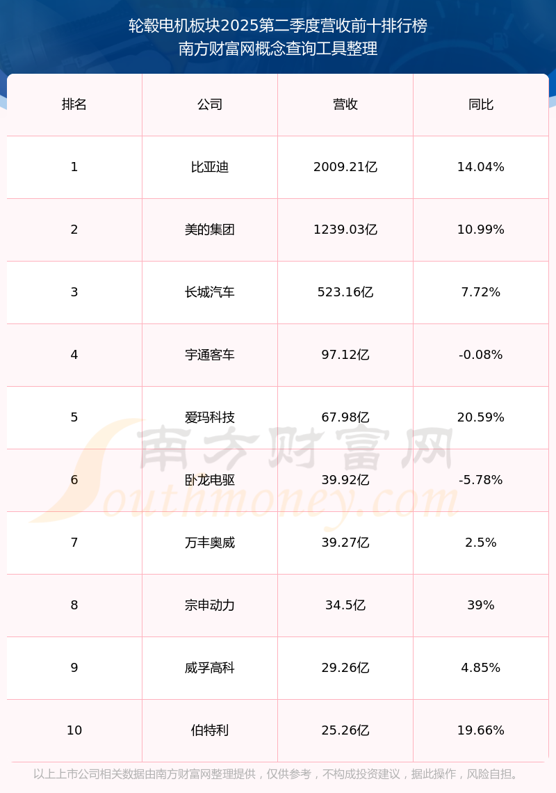 按照南方財(cái)富網(wǎng)概念查詢(xún)工具統(tǒng)計(jì),該股所屬板塊為輪轂電機(jī)板塊,該板塊共有39只股票,泉峰汽車(chē)2025第二季度營(yíng)收在該板塊中排名為第27名,該板塊2025第二季度營(yíng)收排名前十的股票如下表: