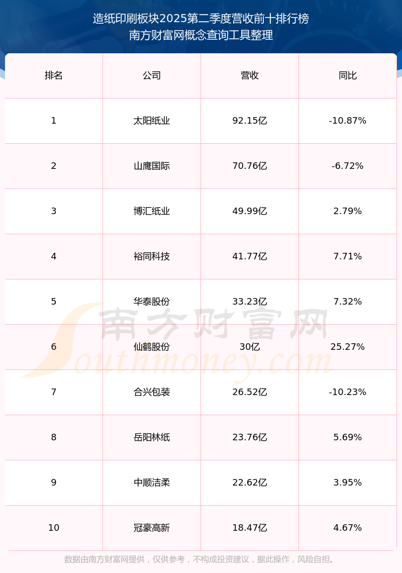 按照南方財富網概念查詢工具統(tǒng)計,該股所屬板塊為造紙印刷板塊,該板塊共有47只股票,岳陽林紙2025第二季度營收在該板塊中排名為第8名,該板塊2025第二季度營收排名前十的股票如下表: