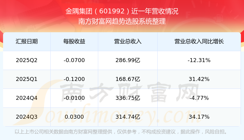 于2025年第二季度,金隅集團(tuán)披露了其業(yè)績(jī)表現(xiàn),其中主營(yíng)業(yè)務(wù)收入286.99億元,相較于去年同期-12.31%。此外,公司歸屬于母公司的凈利潤(rùn)為-2.61億元,同比增長(zhǎng)了-152%。在扣除所有非經(jīng)常性損益后,凈利潤(rùn)-6.67億元,同比增長(zhǎng)-1.34%。