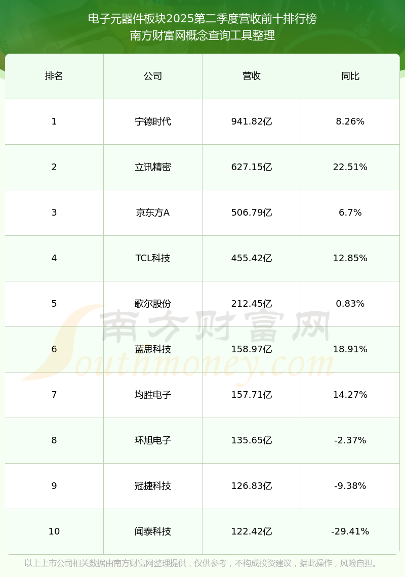 按照南方財(cái)富網(wǎng)概念查詢工具統(tǒng)計(jì),該股所屬板塊為電子元器件板塊,該板塊共有160只股票,宏微科技2025第二季度營(yíng)收在該板塊中排名為第160名,該板塊2025第二季度營(yíng)收排名前十的股票如下表: