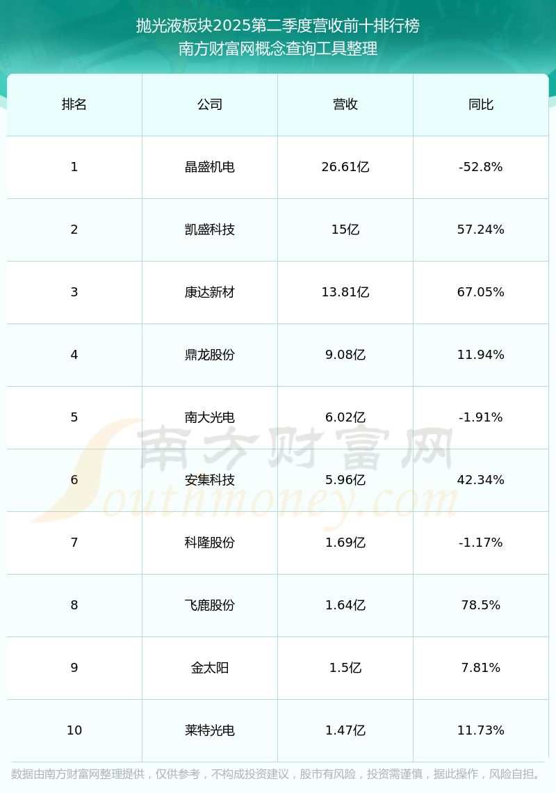 按照南方財(cái)富網(wǎng)概念查詢工具統(tǒng)計(jì),該股所屬板塊為拋光液板塊,該板塊共有12只股票,安集科技2025第二季度營(yíng)收在該板塊中排名為第6名,該板塊2025第二季度營(yíng)收排名前十的股票如下表: