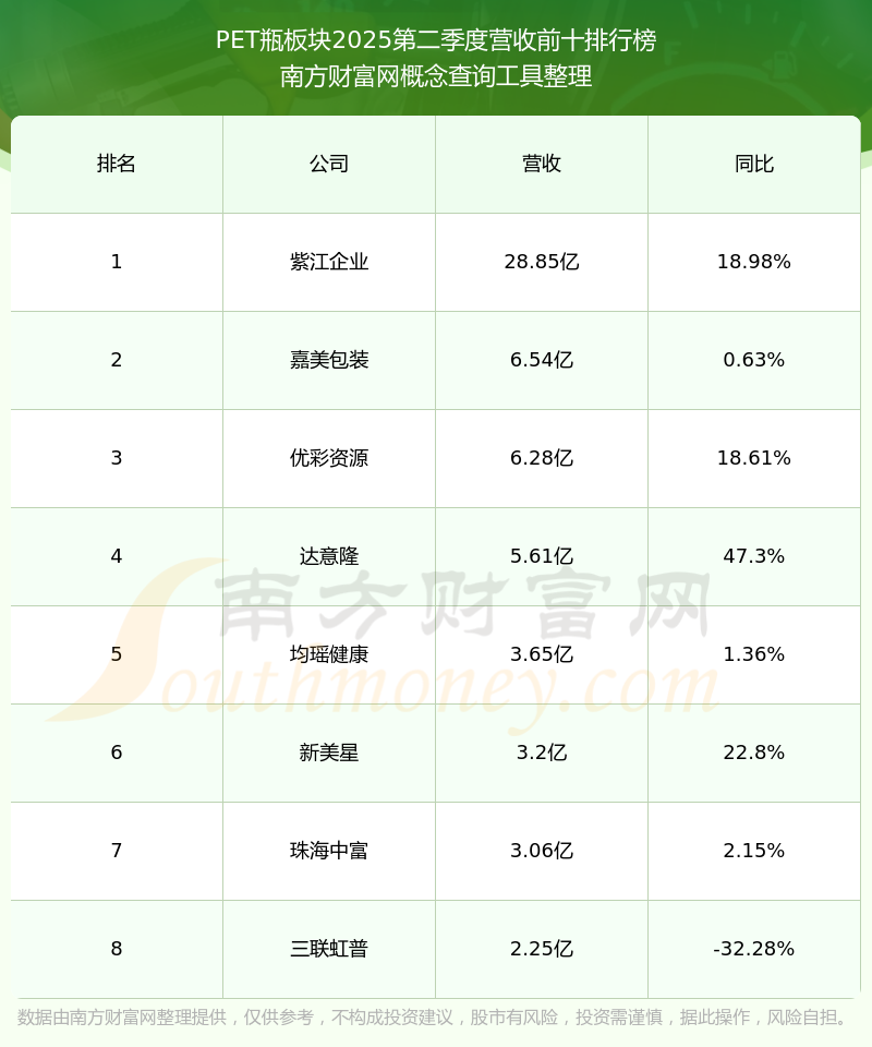 按照南方財富網概念查詢工具統(tǒng)計,該股所屬板塊為PET瓶板塊,該板塊共有8只股票,紫江企業(yè)2025第二季度營收在該板塊中排名為第1名,該板塊2025第二季度營收排名前十的股票如下表: