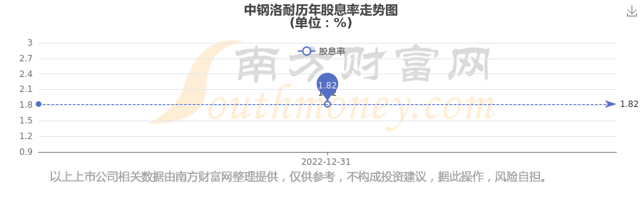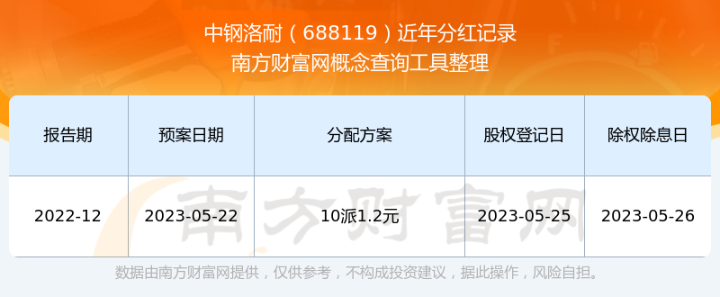 中鋼洛耐最新一次公布的分紅方案為10派1.2元。本次權益分派股權登記日為2023年5月25日,除權除息日為2023年5月26日,派息日為2023年5月26日。