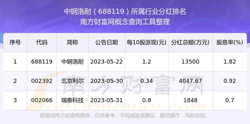 按照南方財富網(wǎng)趨勢選股系統(tǒng)統(tǒng)計,中鋼洛耐所屬行業(yè)為耐火材料行業(yè),耐火材料行業(yè)分紅排名情況如下表:
