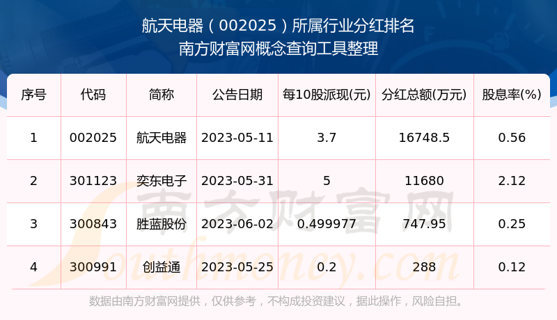 按照南方財富網(wǎng)趨勢選股系統(tǒng)統(tǒng)計,航天電器所屬行業(yè)為連接器行業(yè),連接器行業(yè)分紅排名情況如下表: