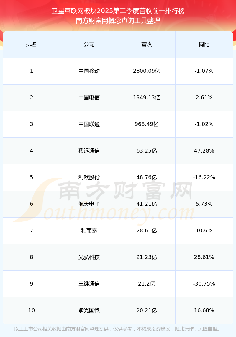 按照南方財(cái)富網(wǎng)概念查詢工具統(tǒng)計(jì),該股所屬板塊為衛(wèi)星互聯(lián)網(wǎng)板塊,該板塊共有147只股票,中國(guó)衛(wèi)通2025第二季度營(yíng)收在該板塊中排名為第40名,該板塊2025第二季度營(yíng)收排名前十的股票如下表: