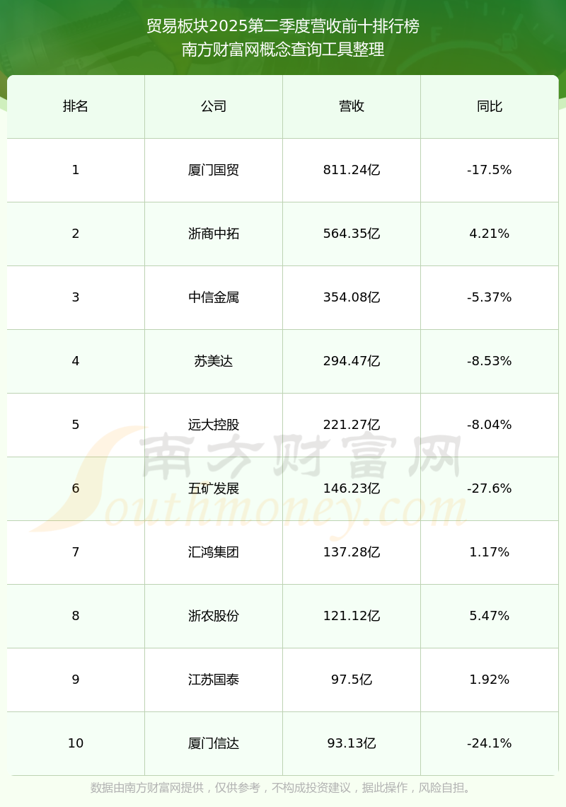按照南方財富網(wǎng)概念查詢工具統(tǒng)計,該股所屬板塊為貿(mào)易板塊,該板塊共有37只股票,海南椰島2025第二季度營收在該板塊中排名為第37名,該板塊2025第二季度營收排名前十的股票如下表: