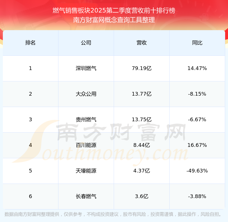 按照南方財富網(wǎng)概念查詢工具統(tǒng)計,該股所屬板塊為燃氣銷售板塊,該板塊共有6只股票,成都燃氣2025第二季度營收在該板塊中排名為第6名,該板塊2025第二季度營收排名前十的股票如下表: