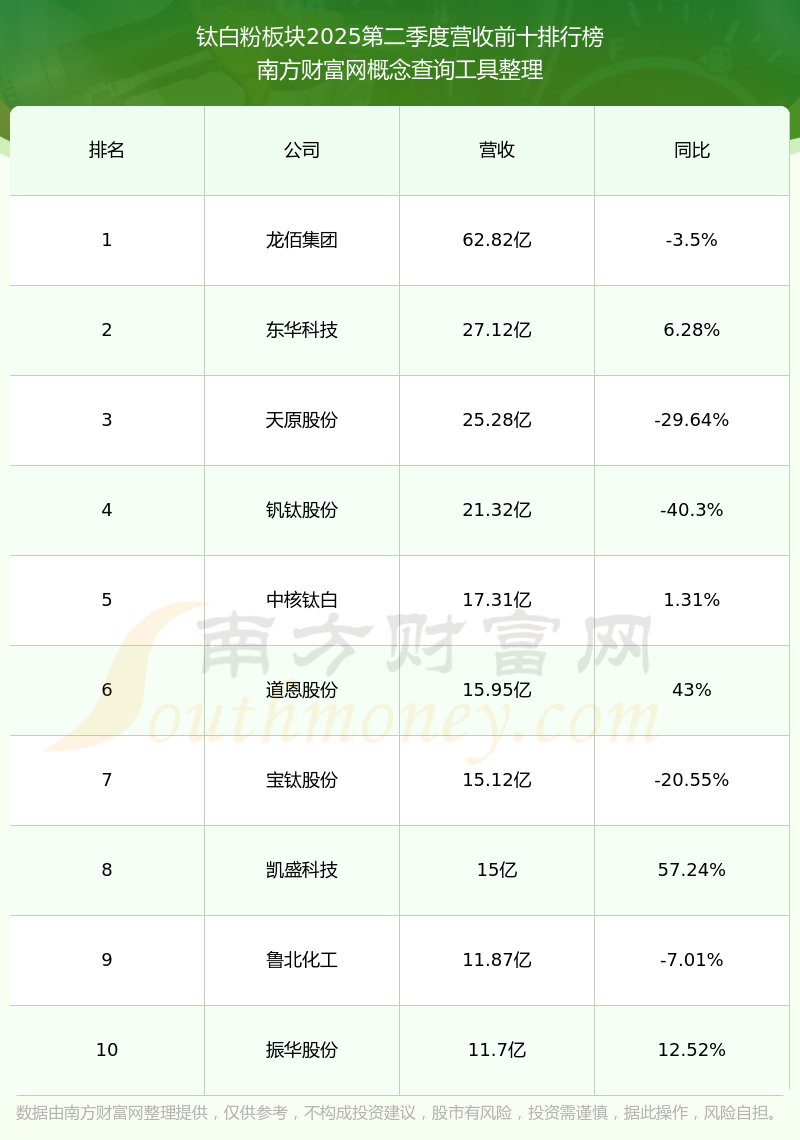 按照南方財(cái)富網(wǎng)概念查詢工具統(tǒng)計(jì),該股所屬板塊為鈦白粉板塊,該板塊共有16只股票,振華股份2025第二季度營收在該板塊中排名為第10名,該板塊2025第二季度營收排名前十的股票如下表: