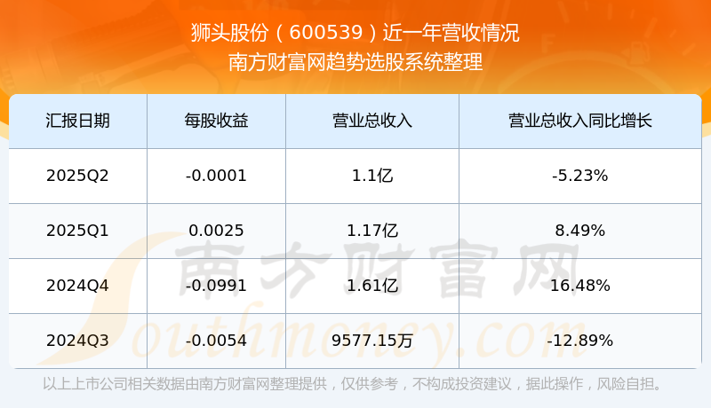 財(cái)報(bào)顯示,2025年第二季度獅頭股份營(yíng)收1.1億元,同比增長(zhǎng)-5.23%,凈利潤(rùn)-2.09萬元,同比增長(zhǎng)98.95%。