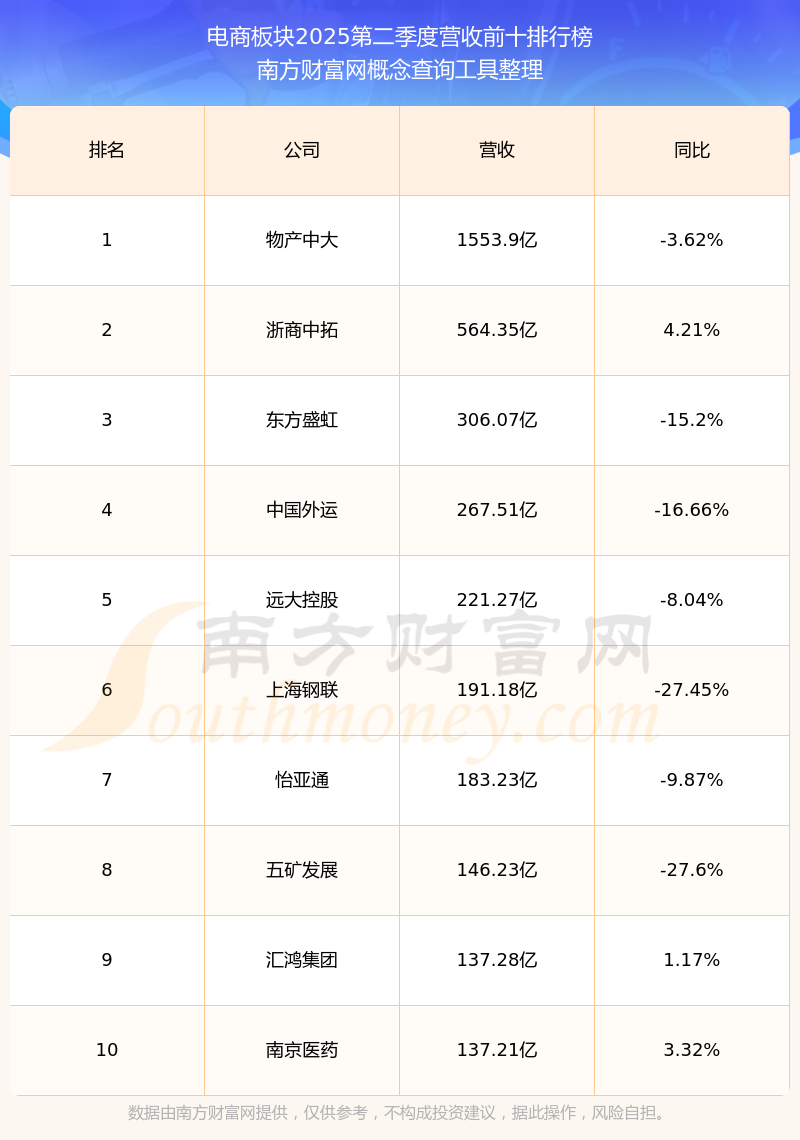 按照南方財(cái)富網(wǎng)概念查詢工具統(tǒng)計(jì),該股所屬板塊為電商板塊,該板塊共有231只股票,獅頭股份2025第二季度營(yíng)收在該板塊中排名為第213名,該板塊2025第二季度營(yíng)收排名前十的股票如下表: