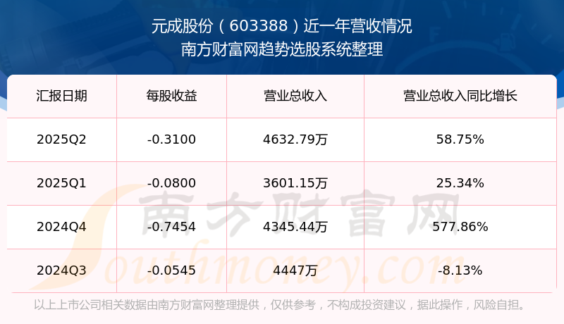 元成股份2025年第二季度財(cái)報(bào)顯示,公司主營(yíng)收入4632.79萬(wàn)元,同比58.75%;歸母凈利潤(rùn)-1.01億元,同比-137.51%;扣非凈利潤(rùn)-5234.77萬(wàn)元,同比-236.69%;