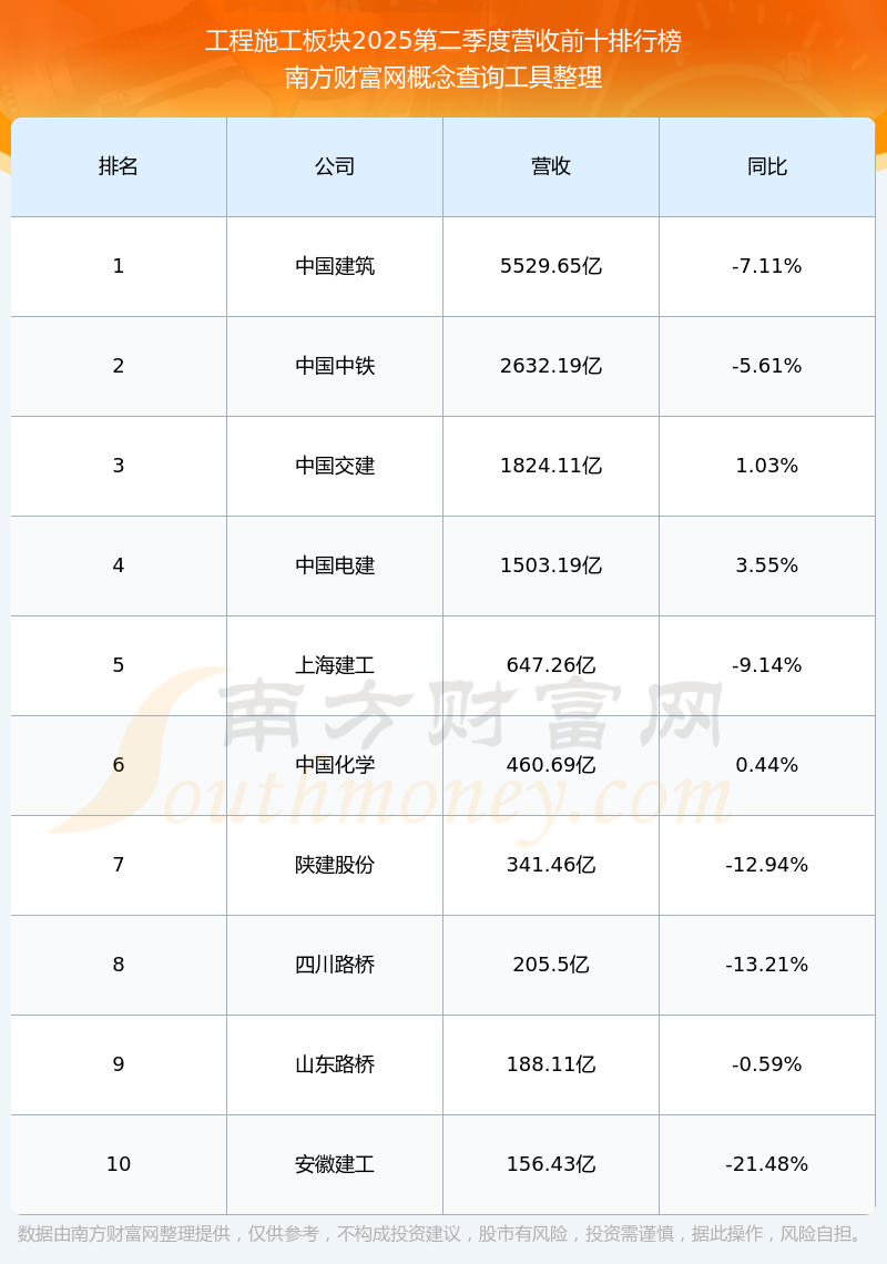 按照南方財(cái)富網(wǎng)概念查詢工具統(tǒng)計(jì),該股所屬板塊為工程施工板塊,該板塊共有56只股票,元成股份2025第二季度營(yíng)收在該板塊中排名為第56名,該板塊2025第二季度營(yíng)收排名前十的股票如下表: