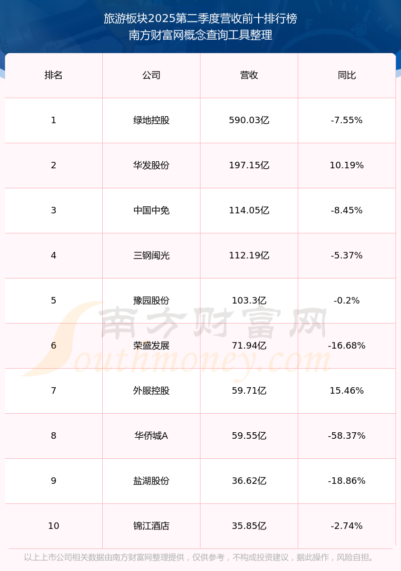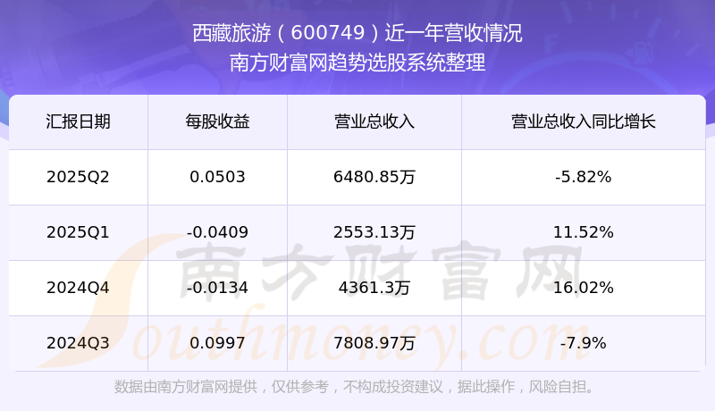 按照南方財(cái)富網(wǎng)概念查詢工具統(tǒng)計(jì),該股所屬板塊為旅游板塊,該板塊共有152只股票,西藏旅游2025第二季度營收在該板塊中排名為第143名,該板塊2025第二季度營收排名前十的股票如下表: