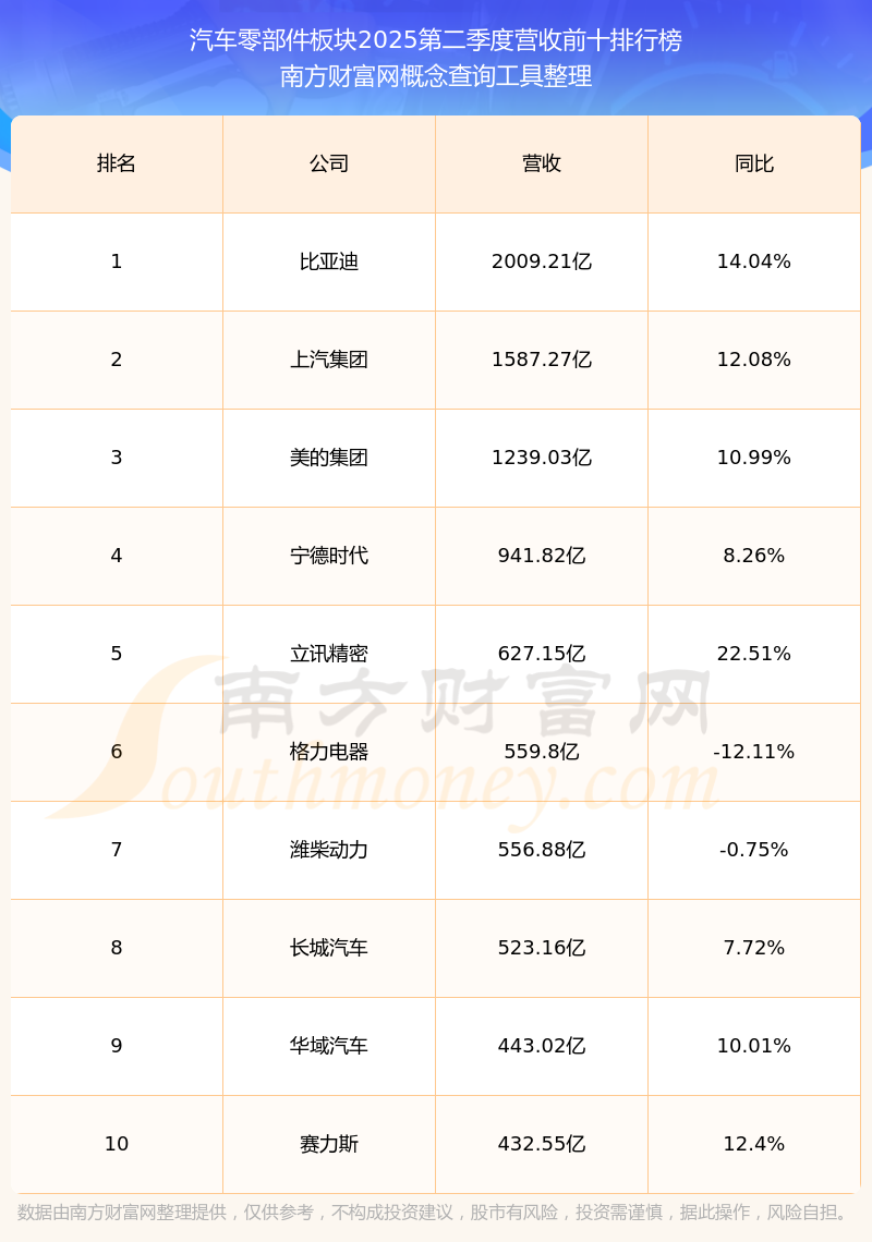 按照南方財富網(wǎng)概念查詢工具統(tǒng)計,該股所屬板塊為汽車零部件板塊,該板塊共有567只股票,英利汽車2025第二季度營收在該板塊中排名為第194名,該板塊2025第二季度營收排名前十的股票如下表: