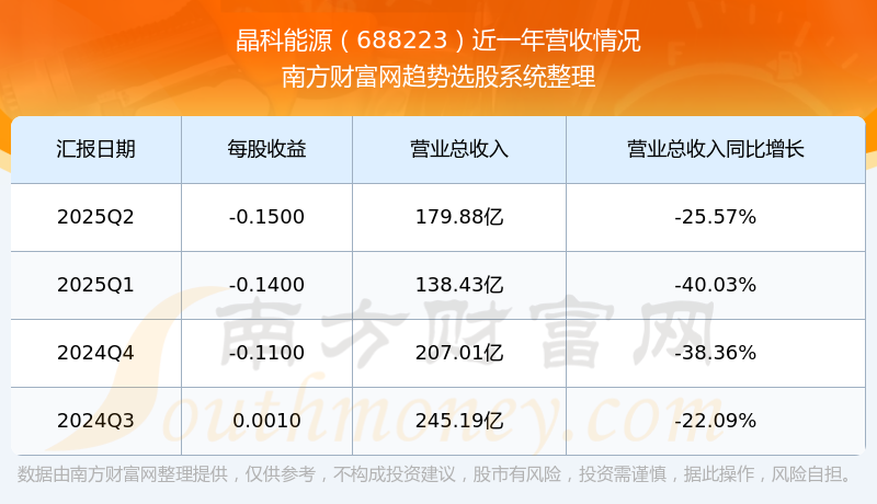 于2025年第二季度,晶科能源披露了其業(yè)績表現(xiàn),其中主營業(yè)務(wù)收入179.88億元,相較于去年同期-25.57%。此外,公司歸屬于母公司的凈利潤為-15.19億元,同比增長了-6336.82%。在扣除所有非經(jīng)常性損益后,凈利潤-13.09億元,同比增長-5106.18%。