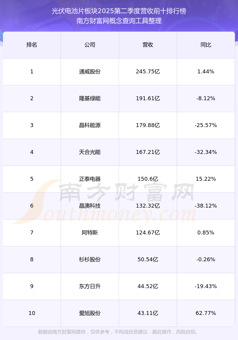 按照南方財富網(wǎng)概念查詢工具統(tǒng)計,該股所屬板塊為光伏電池片板塊,該板塊共有26只股票,晶科能源2025第二季度營收在該板塊中排名為第3名,該板塊2025第二季度營收排名前十的股票如下表: