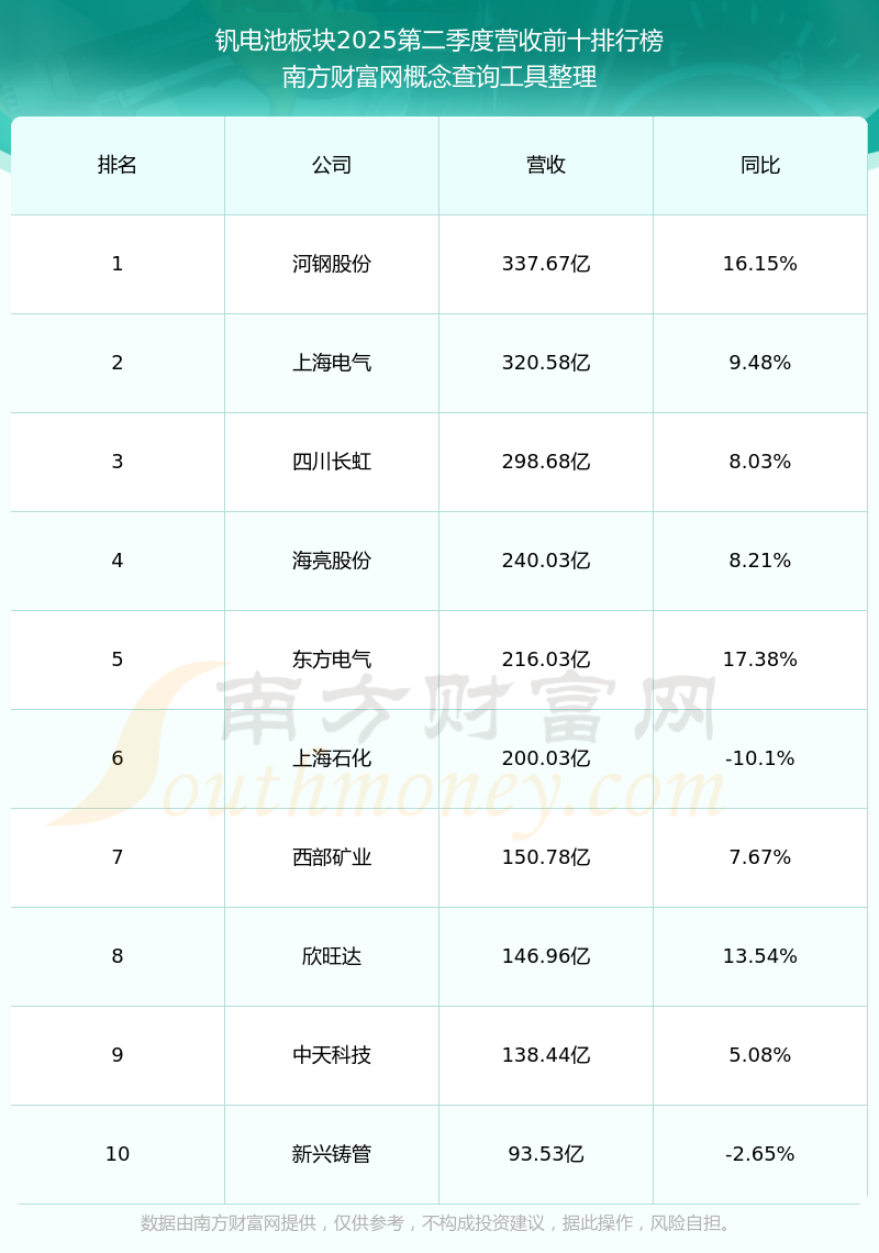 按照南方財富網(wǎng)概念查詢工具統(tǒng)計,該股所屬板塊為釩電池板塊,該板塊共有51只股票,國網(wǎng)英大2025第二季度營收在該板塊中排名為第17名,該板塊2025第二季度營收排名前十的股票如下表: