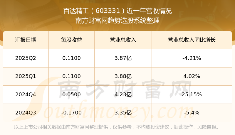 百達(dá)精工(603331)發(fā)布2025年第二季度財(cái)報(bào)。2025年第二季度百達(dá)精工實(shí)現(xiàn)營(yíng)業(yè)收入3.87億元,同比增加-4.21元%,環(huán)比增加-0.39%;凈利潤(rùn)為2274.22萬(wàn)元,同比增長(zhǎng)-12.06%,環(huán)比增長(zhǎng)5.85%。