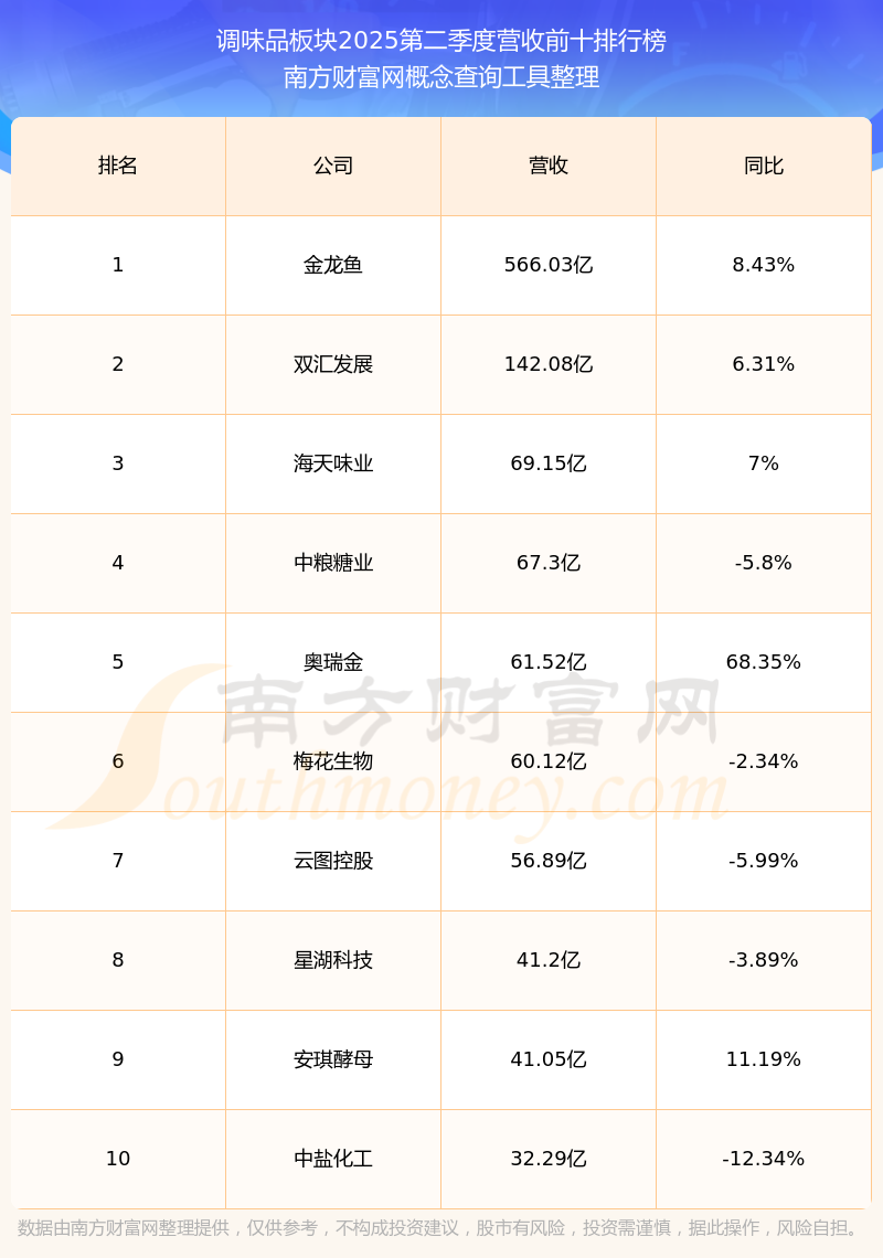 按照南方財富網(wǎng)概念查詢工具統(tǒng)計,該股所屬板塊為調(diào)味品板塊,該板塊共有49只股票,安記食品2025第二季度營收在該板塊中排名為第46名,該板塊2025第二季度營收排名前十的股票如下表: