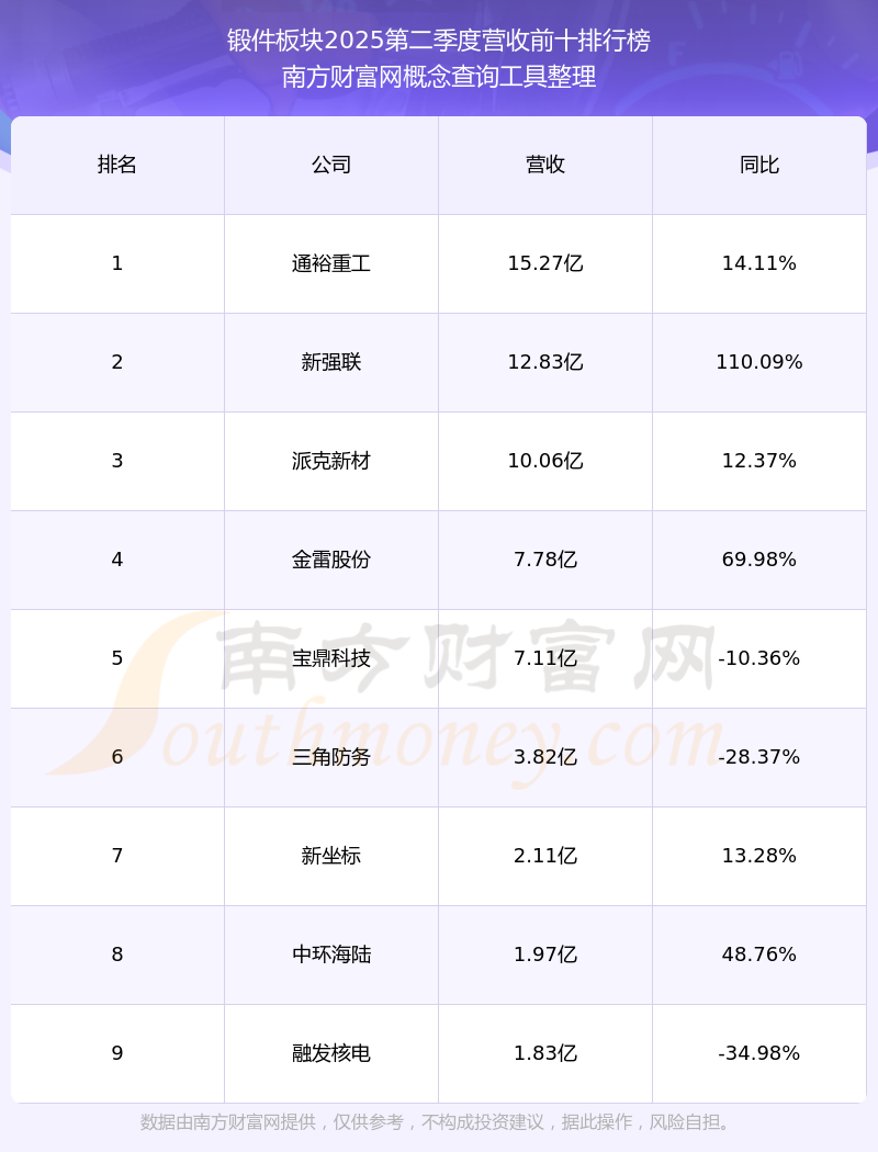 按照南方財(cái)富網(wǎng)概念查詢工具統(tǒng)計(jì),該股所屬板塊為鍛件板塊,該板塊共有9只股票,派克新材2025第二季度營收在該板塊中排名為第3名,該板塊2025第二季度營收排名前十的股票如下表:
