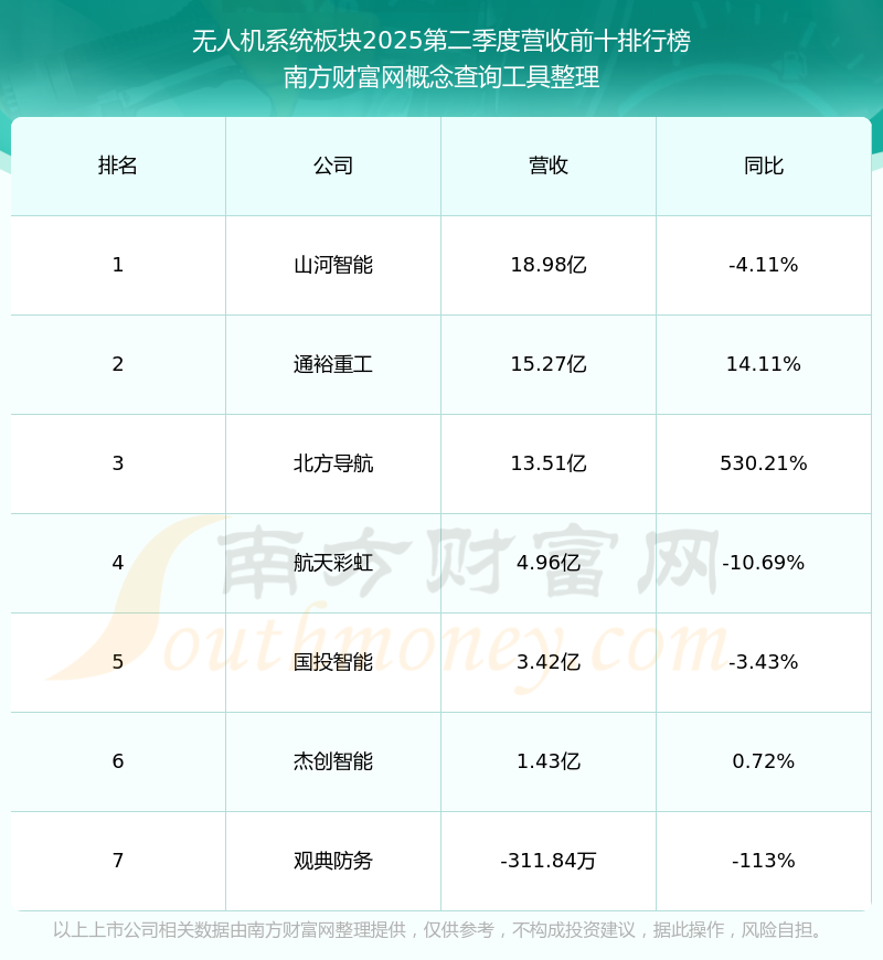 按照南方財富網(wǎng)概念查詢工具統(tǒng)計,該股所屬板塊為無人機系統(tǒng)板塊,該板塊共有7只股票,中無人機2025第二季度營收在該板塊中排名為第7名,該板塊2025第二季度營收排名前十的股票如下表: