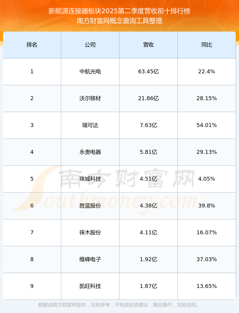按照南方財(cái)富網(wǎng)概念查詢工具統(tǒng)計(jì),該股所屬板塊為新能源連接器板塊,該板塊共有9只股票,瑞可達(dá)2025第二季度營收在該板塊中排名為第3名,該板塊2025第二季度營收排名前十的股票如下表: