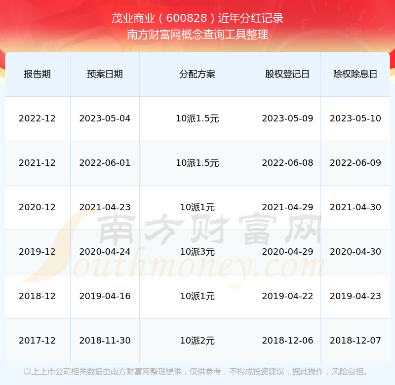 茂業(yè)商業(yè)最新一次公布的分紅方案為10派1.5元。本次權(quán)益分派股權(quán)登記日為2023年5月9日,除權(quán)除息日為2023年5月10日,派息日為2023年5月10日。