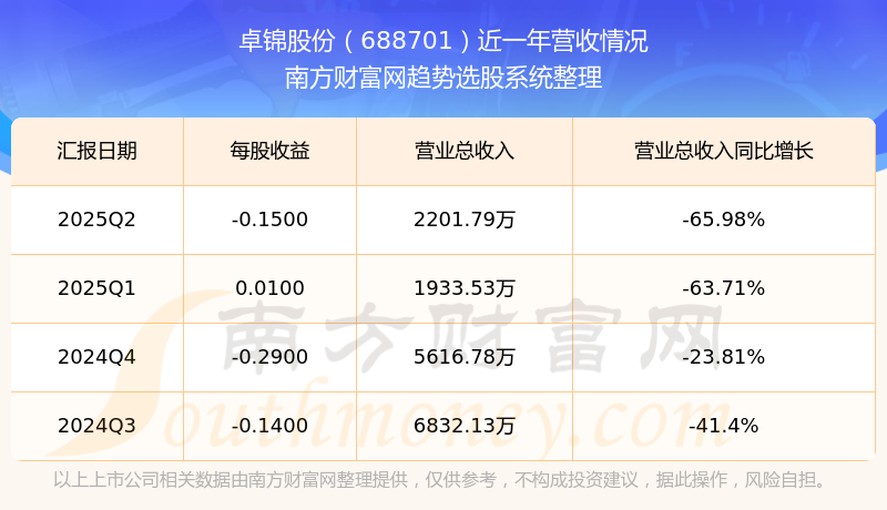 財(cái)報(bào)顯示,2025年第二季度卓錦股份營(yíng)收2201.79萬元,同比增長(zhǎng)-65.98%,凈利潤(rùn)-2010.78萬元,同比增長(zhǎng)-12.96%。