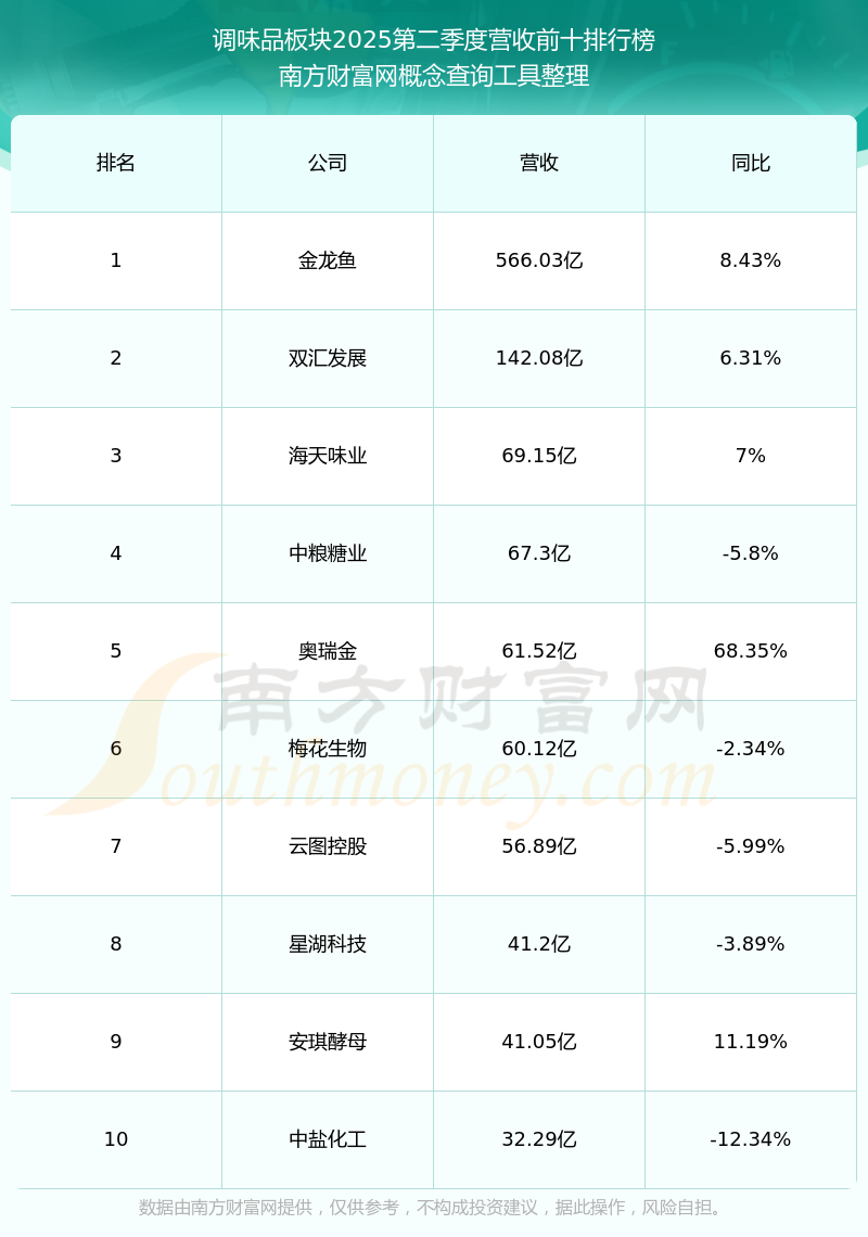 按照南方財(cái)富網(wǎng)概念查詢工具統(tǒng)計(jì),該股所屬板塊為調(diào)味品板塊,該板塊共有49只股票,恒順醋業(yè)2025第二季度營收在該板塊中排名為第34名,該板塊2025第二季度營收排名前十的股票如下表: