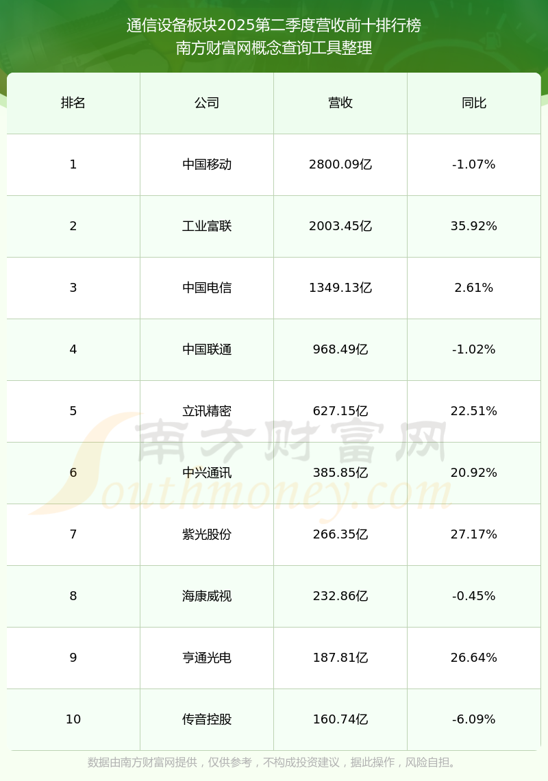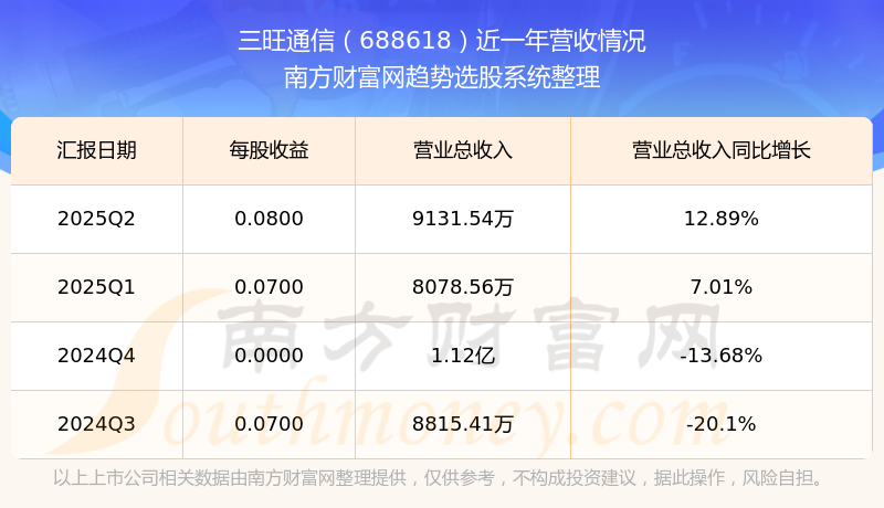 按照南方財(cái)富網(wǎng)概念查詢工具統(tǒng)計(jì),該股所屬板塊為通信設(shè)備板塊,該板塊共有163只股票,三旺通信2025第二季度營(yíng)收在該板塊中排名為第144名,該板塊2025第二季度營(yíng)收排名前十的股票如下表: