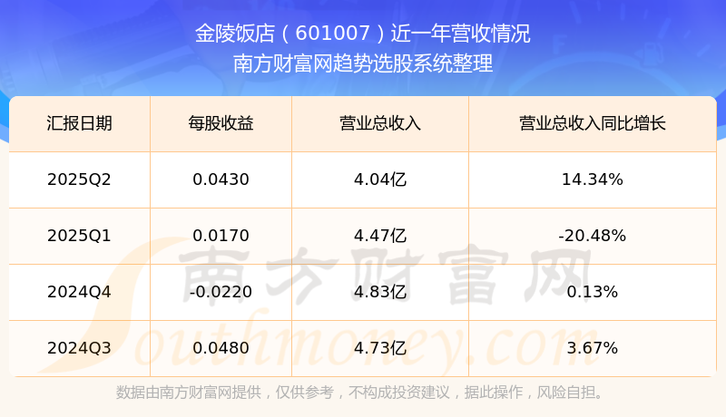 金陵飯店2025年第二季度顯示,公司主營(yíng)收入4.04億元,同比14.34%;歸母凈利潤(rùn)1680.5萬(wàn)元,同比3.3%;扣非凈利潤(rùn)1599.39萬(wàn)元,同比17.39%;