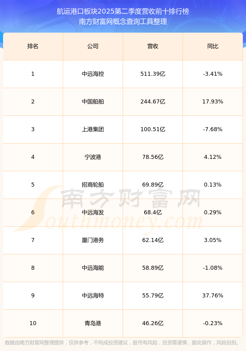 按照南方財(cái)富網(wǎng)概念查詢工具統(tǒng)計(jì),該股所屬板塊為航運(yùn)港口板塊,該板塊共有41只股票,日照港2025第二季度營(yíng)收在該板塊中排名為第18名,該板塊2025第二季度營(yíng)收排名前十的股票如下表:
