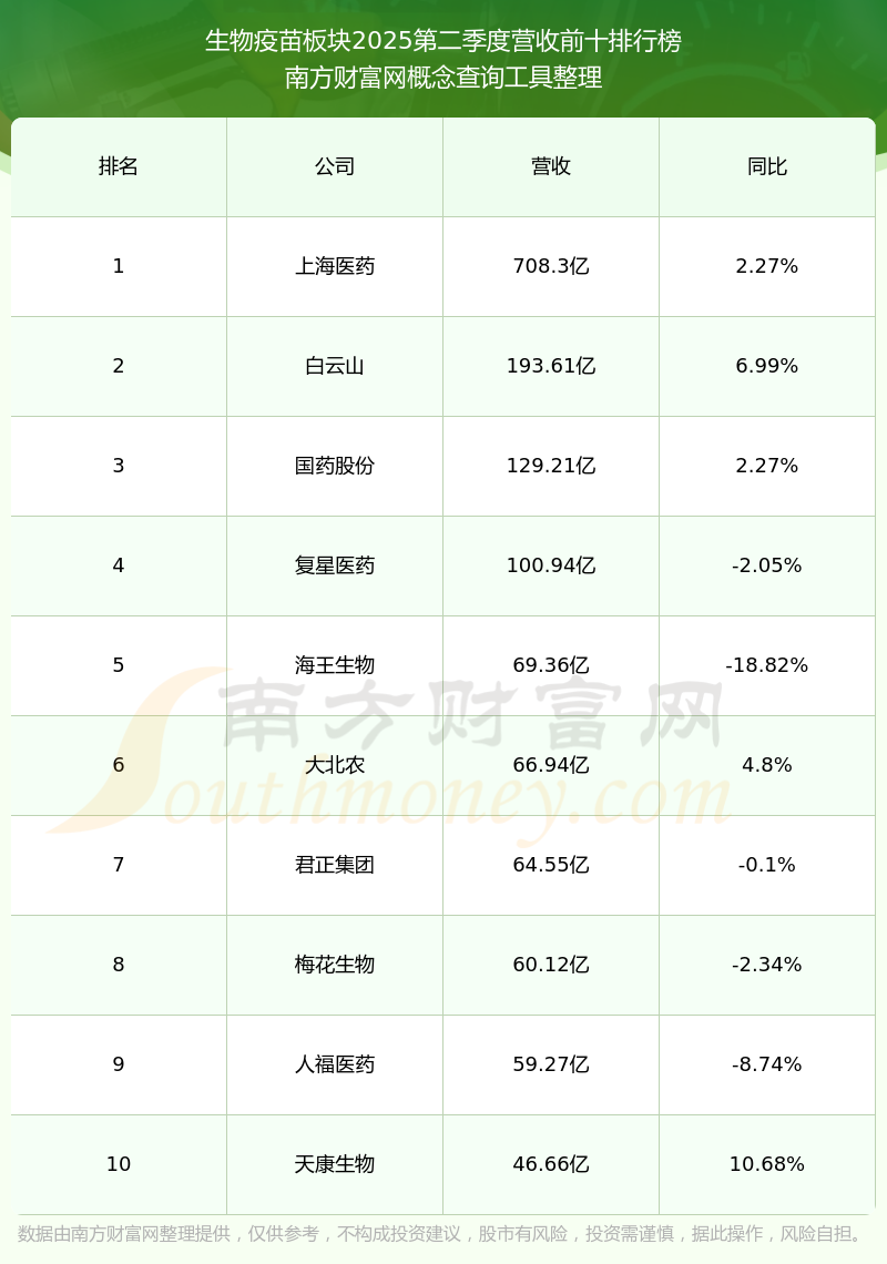 按照南方財(cái)富網(wǎng)概念查詢工具統(tǒng)計(jì),該股所屬板塊為生物疫苗板塊,該板塊共有113只股票,天士力2025第二季度營收在該板塊中排名為第25名,該板塊2025第二季度營收排名前十的股票如下表: